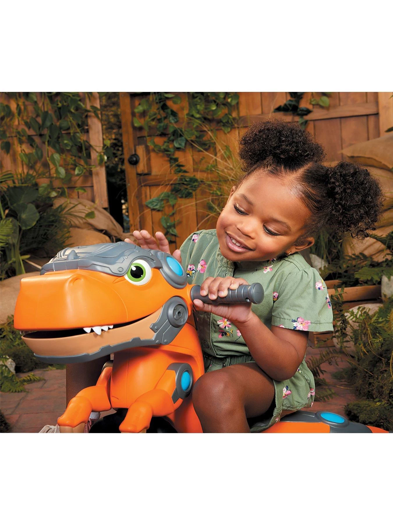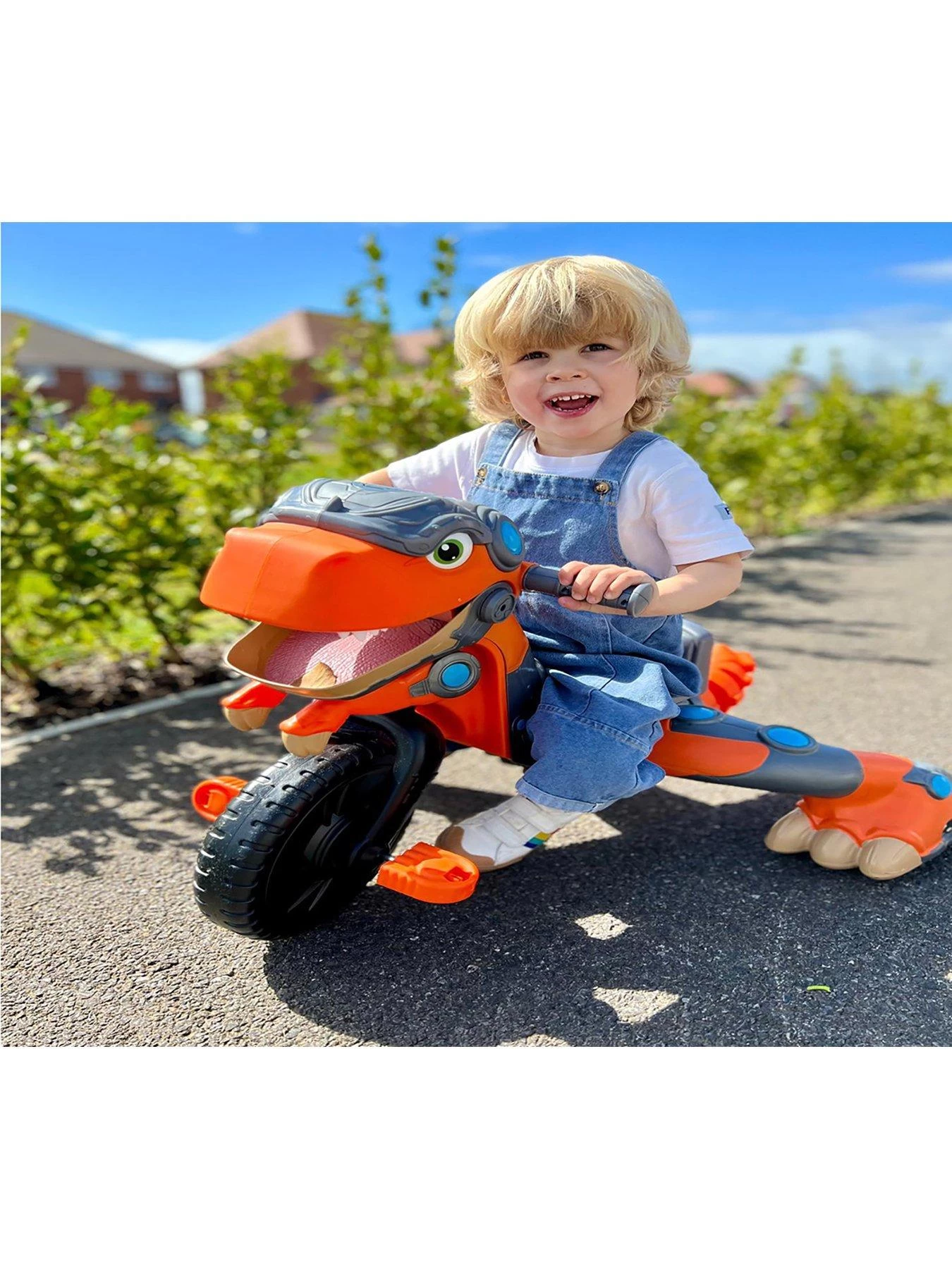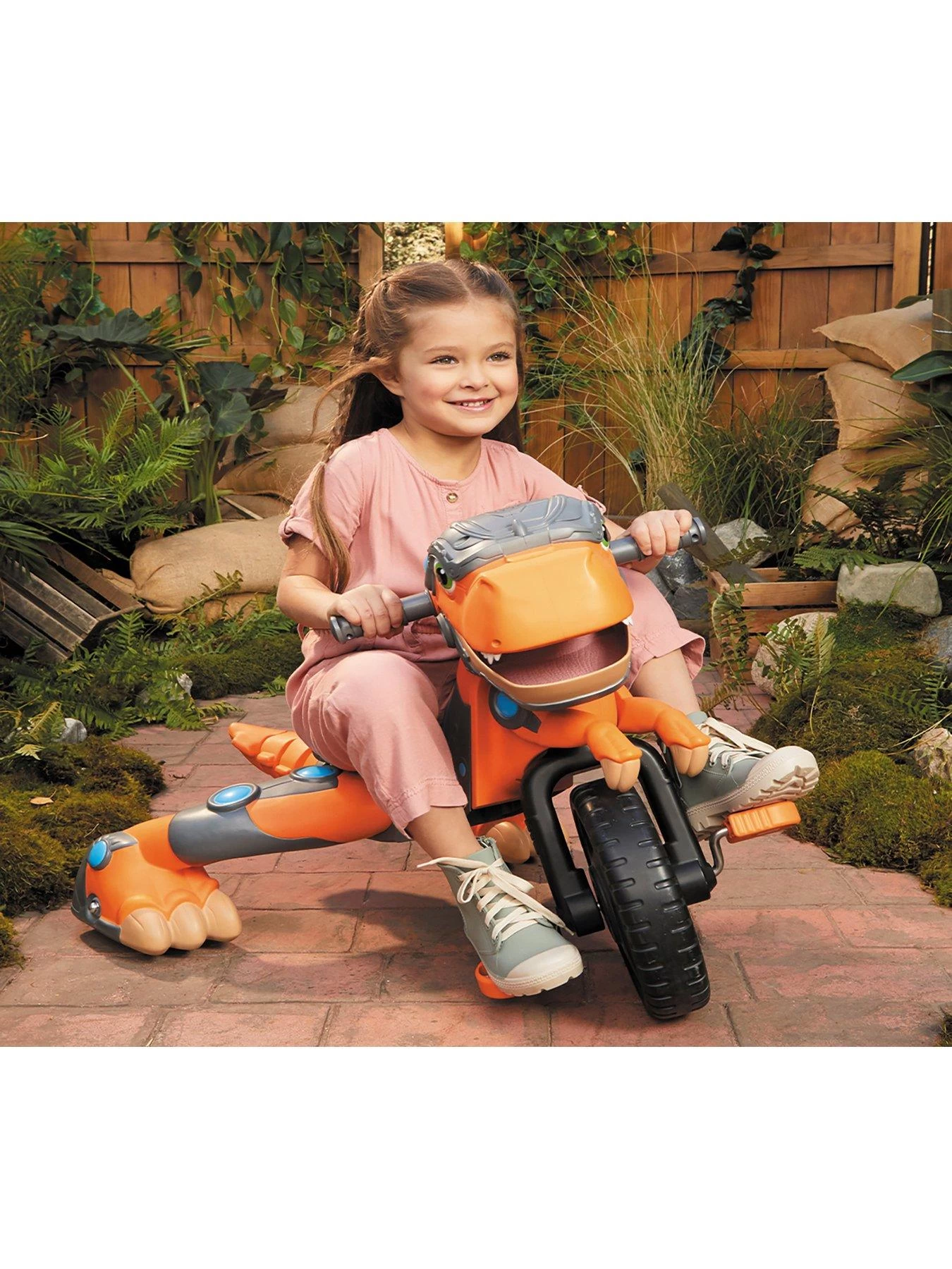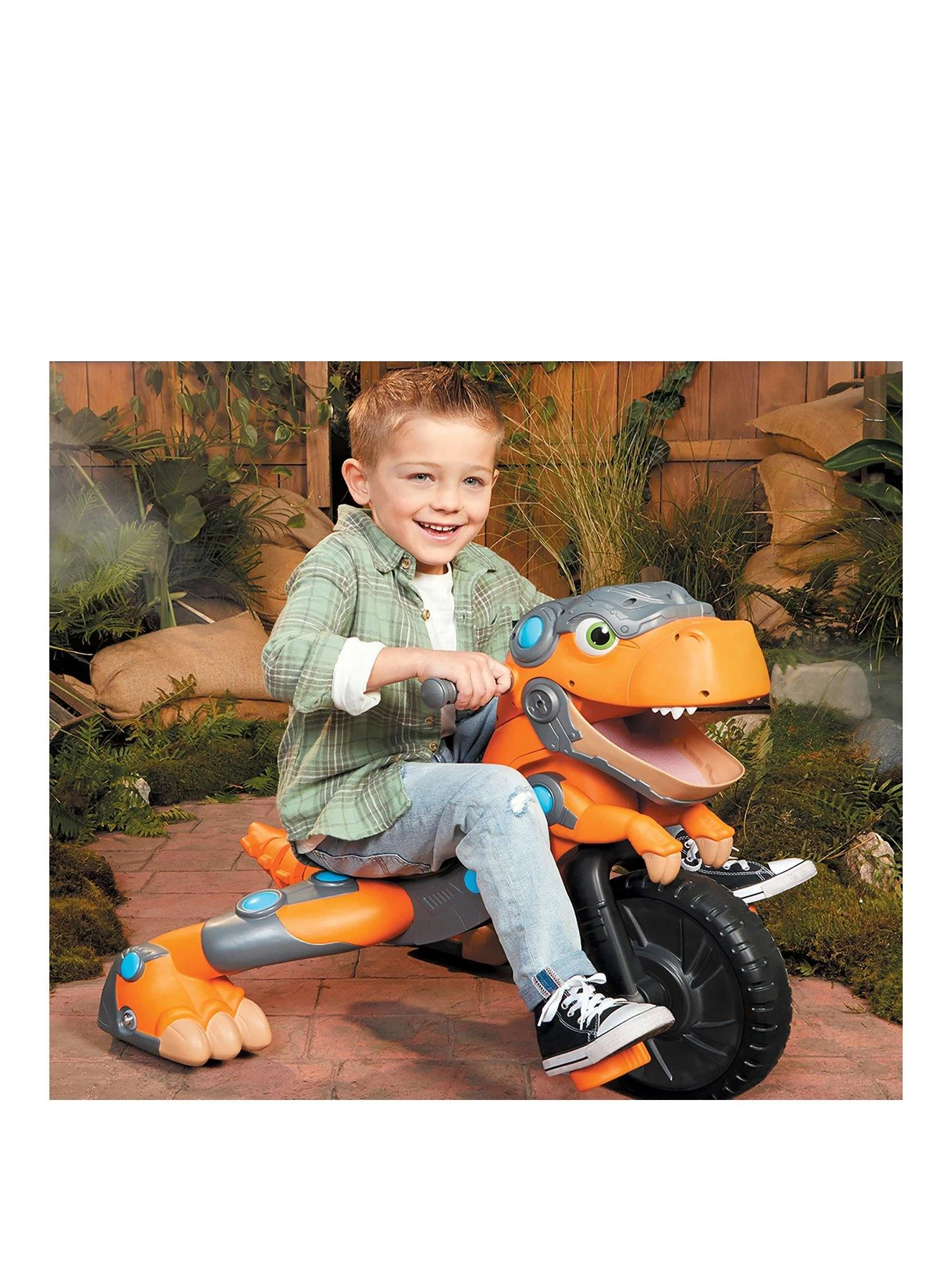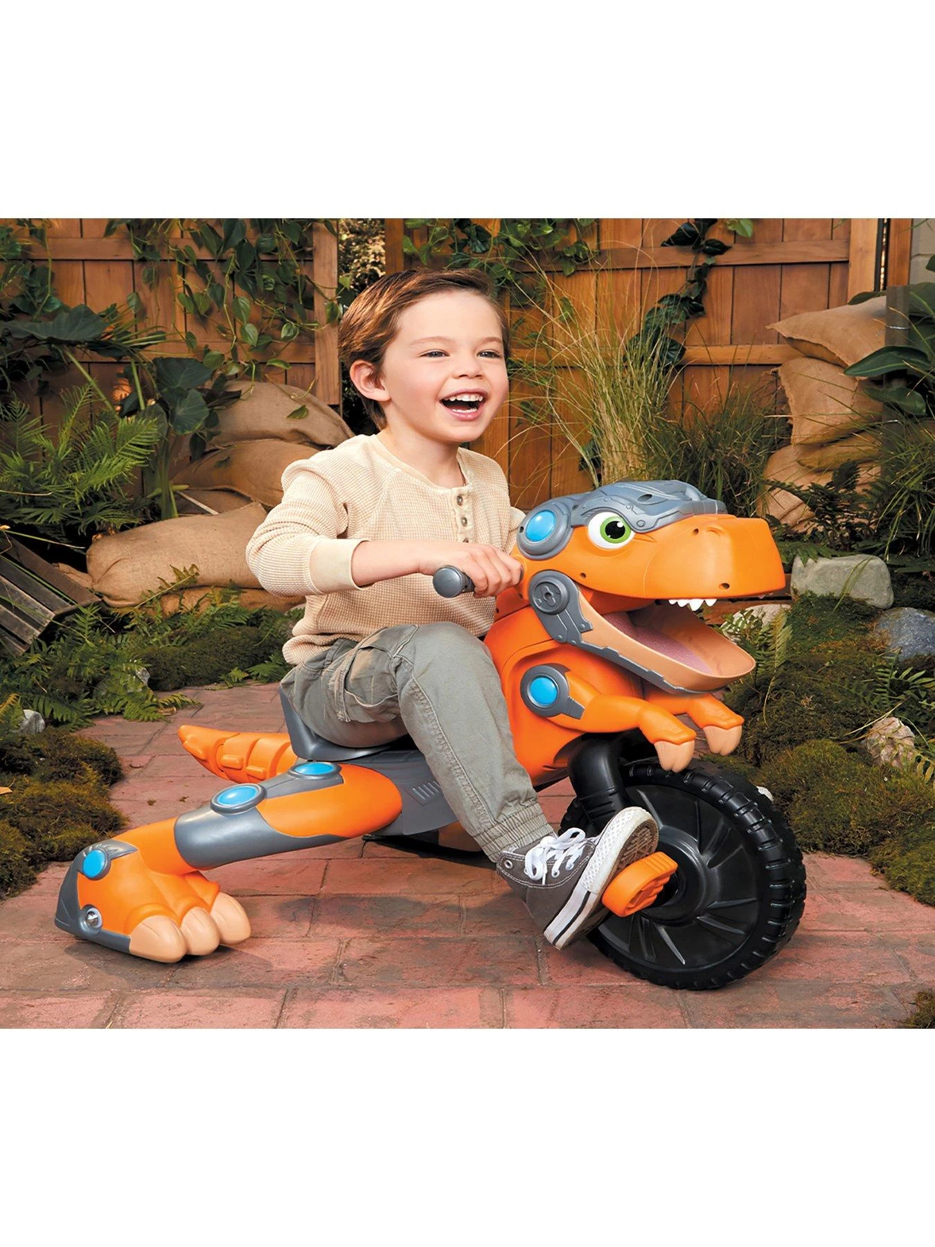 With the push of a button the Chompin’ Dino Trike chomps and roars, plus the tail wags as kids ride.