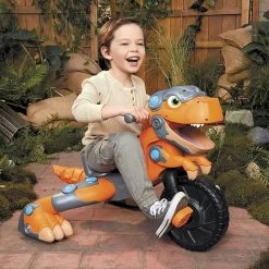 - Interactive Riding: The Chompin ‘Dino Trike is a moving toy that makes dinosaur sounds.