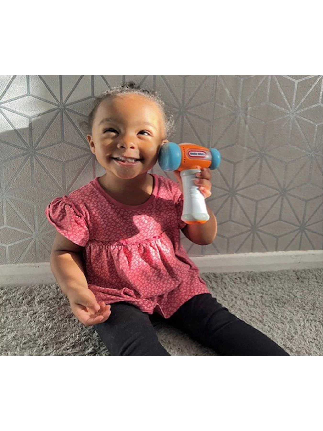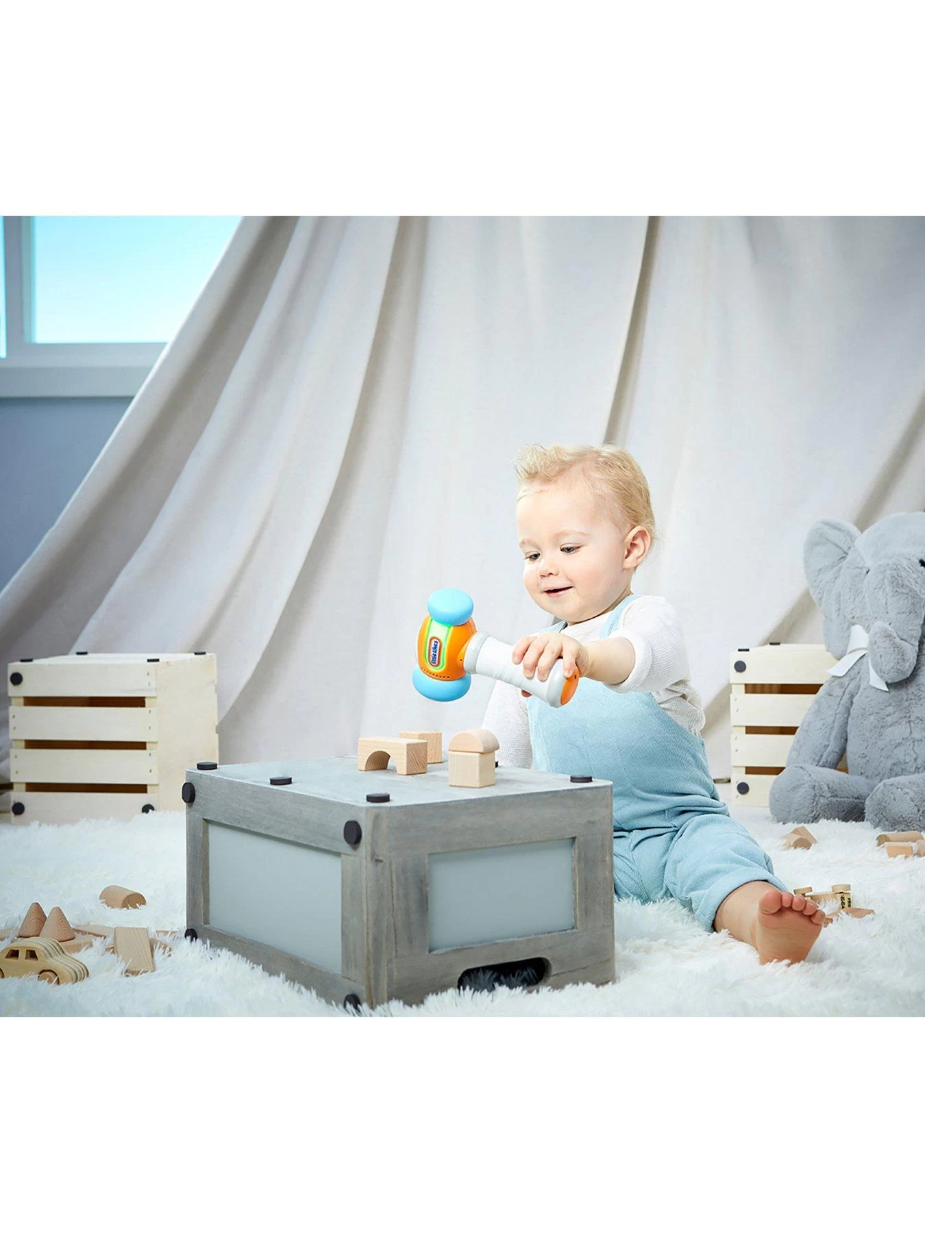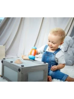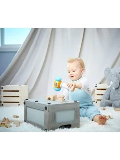 Learn and grow with the tap of a hammer. Discover colours and numbers while having fun. With two soft heads and a textured grip, this toy hammer is perfect for little hands. In number mode, children will love counting from 1-10, as the hammer counts out loud with each tap. In colour mode, the hammer lights up and cycles through bright colours and says the name to match. You can also switch from English to French. And silly sounds will keep everyone giggling.Children ages 9+ months will love this Count & Learn Hammer.