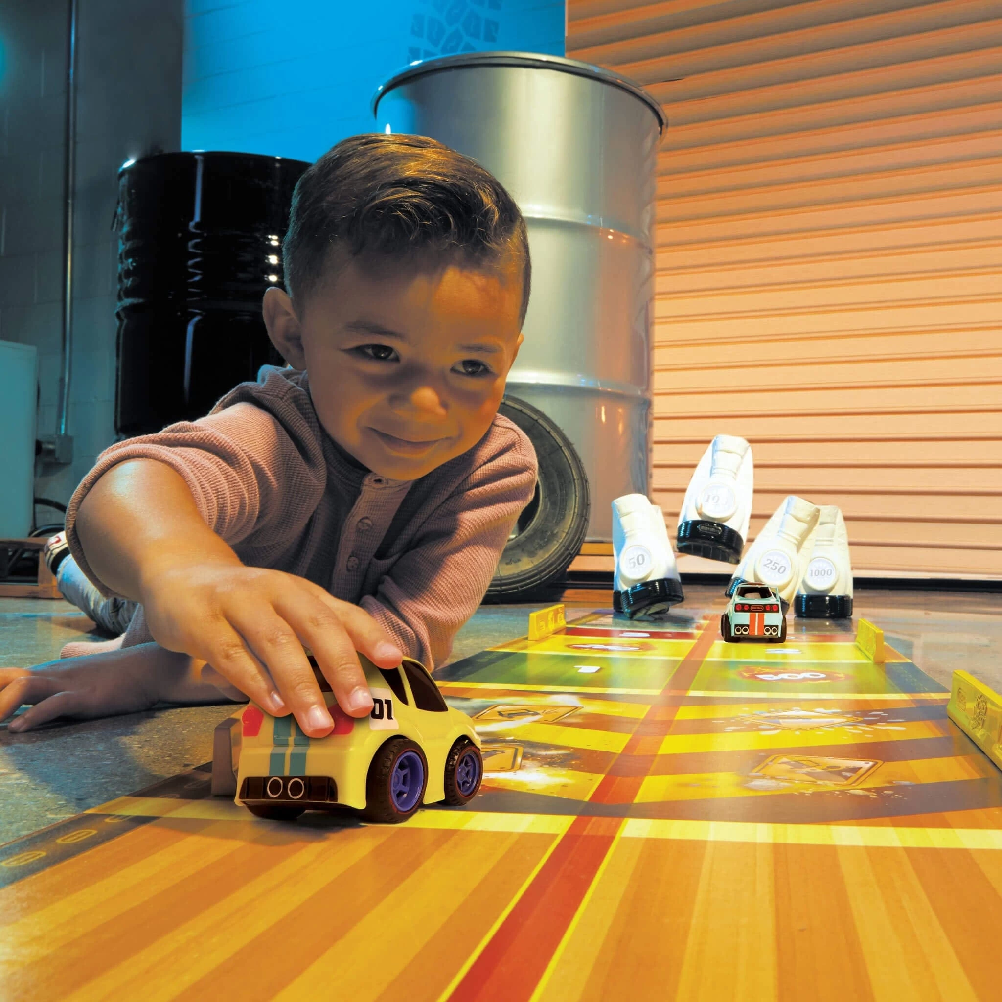 - 3 GAMES IN 1! This action-packed playset can be used in three different ways: Drag Race, Bowling, and Shuffleboard. The sturdy packaging box unfolds into a unique playset and can be used for multiple stunts and tricks