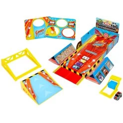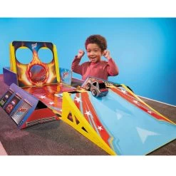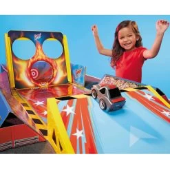 Let ‘em race with the Crazy Fast 4-in-1 Dunk’n, Stunt’n Game’s Set! The sturdy packaging unfolds into a unique 4-in-1 playset for Basketball, Rings of Fire, Cornhole, and Arcade Launch. The realistic-looking pull-back cars can race up to 50 feet at crazy fast speeds! Place the car launcher 3 to 4 feet from the ramp for optimal gameplay.