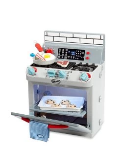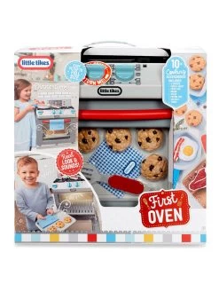 Little ones can pretend to cook and bake just like the grown ups with the super realistic Little Tikes First Oven. This sleek, modern pretend play oven is packed with interactive features: stove top burners that light up, clickable buttons, a working oven light, a removable oven shelf, and turning burner dials. Plus, it makes realistic sounds like burners igniting, water boiling, sizzling, timers ringing, and more to really extend the pretend play for hours. Pretending to cook and do other chores helps kids gain a sense of responsibility, an important part of social-emotional learning.The First Oven is easy to set up to its full size, and fits all 11 included accessories for easy cleanup too. Encourage kids to engage in imaginative pretend play with the First Oven by Little Tikes!