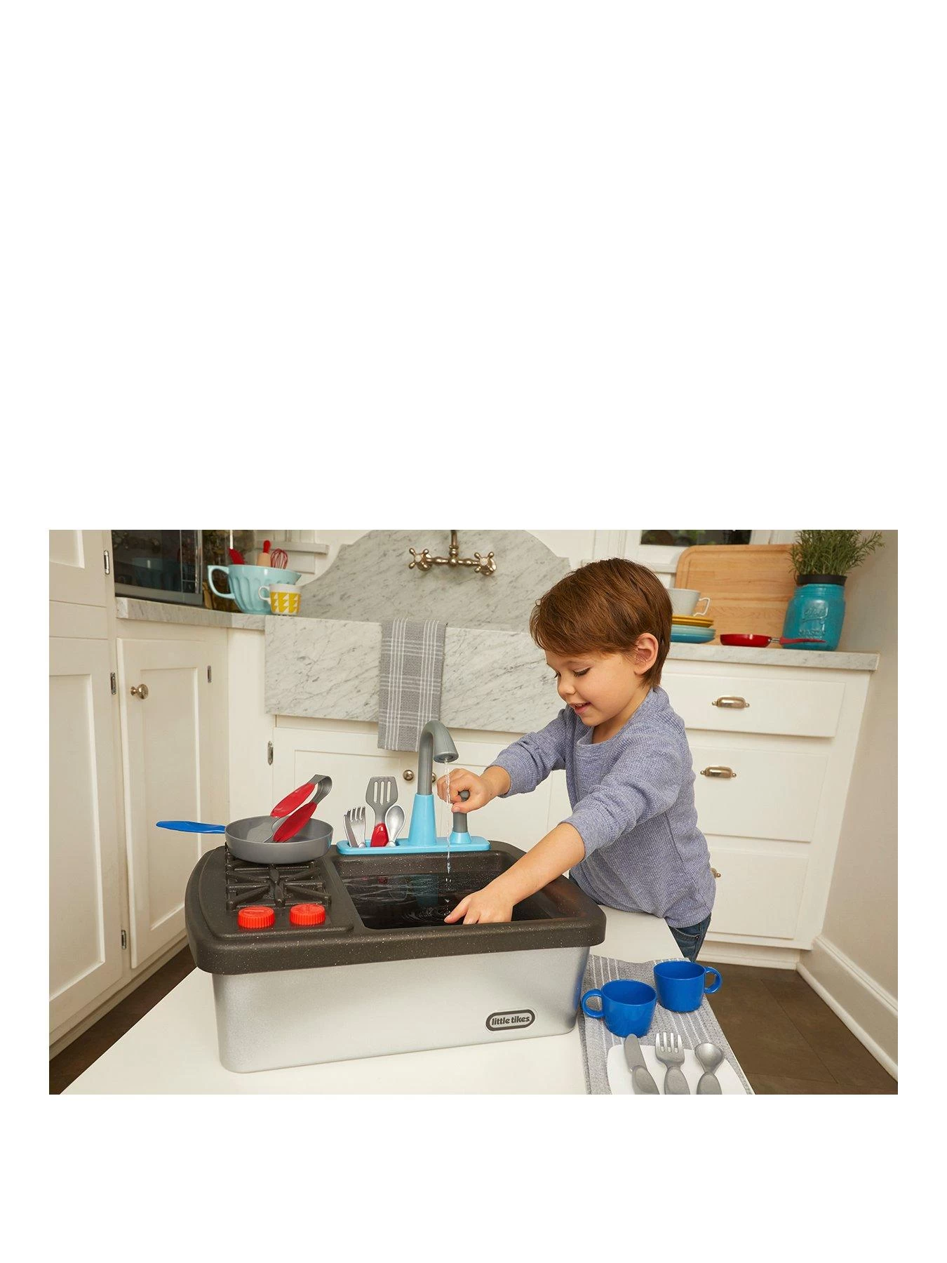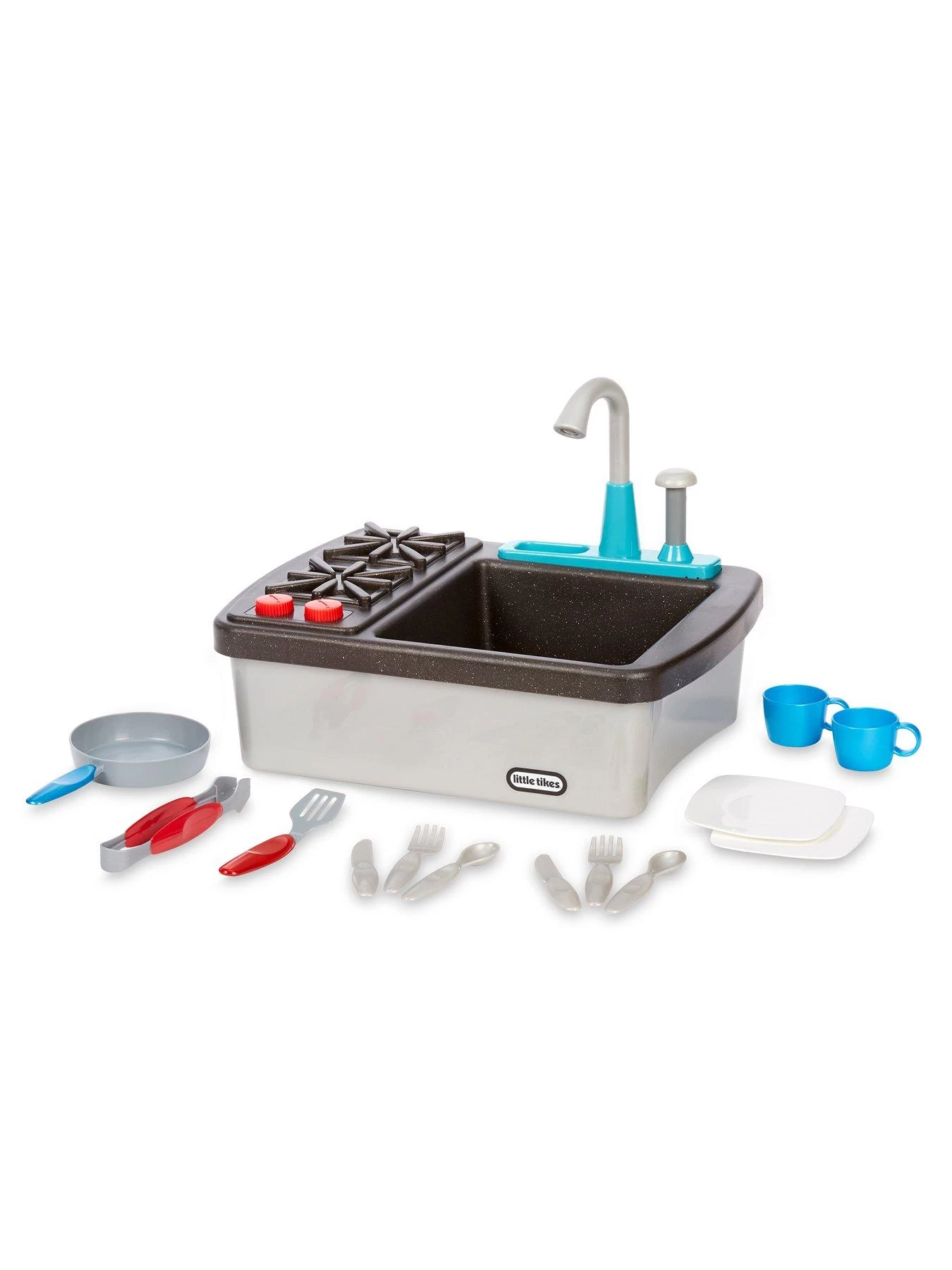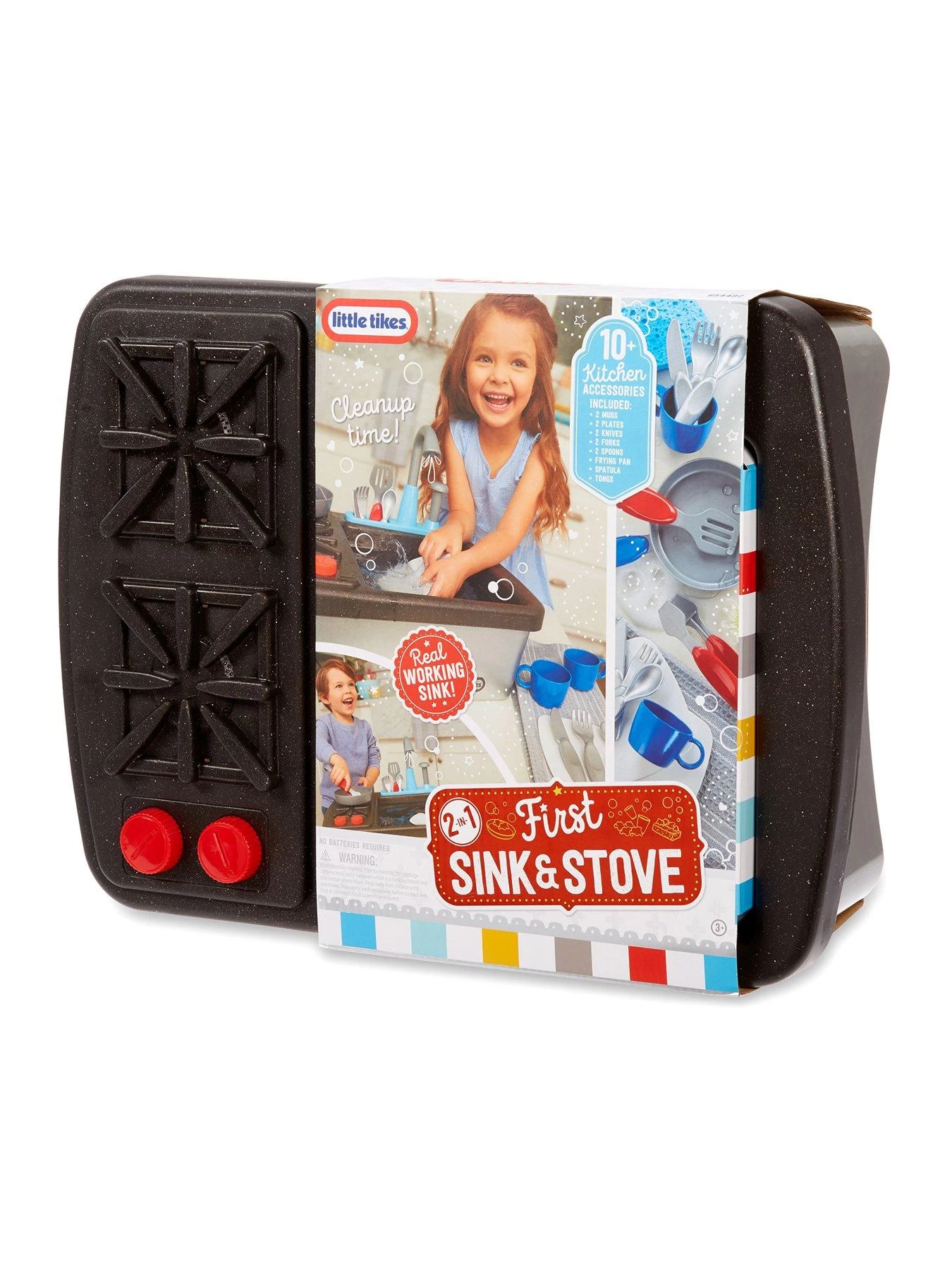 Little ones can pretend to cook and wash dishes just like the grown ups with the realistic Little Tikes First Sink ; Stove. This sleek, modern pretend play combo sink and stove is packed with features: a working water pump, clicking knobs, and more. Plus, it makes realistic sounds when kids turn the knobs on the stove top burners. Pretending to cook, wash dishes, and do other chores helps kids gain a sense of responsibility, an important part of social-emotional learning.The First Sink ; Stove fits all 13 included accessories for easy cleanup too. Encourage kids to engage in imaginative pretend play with the First Sink ; Stove by Little Tikes!