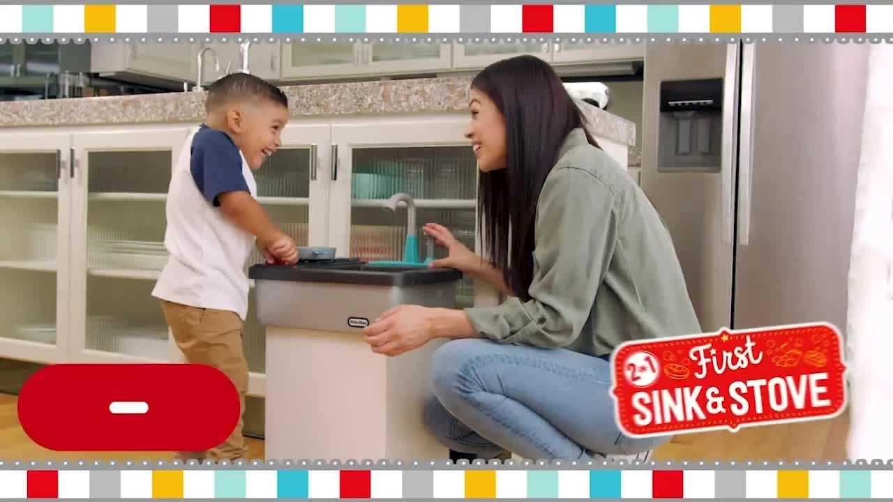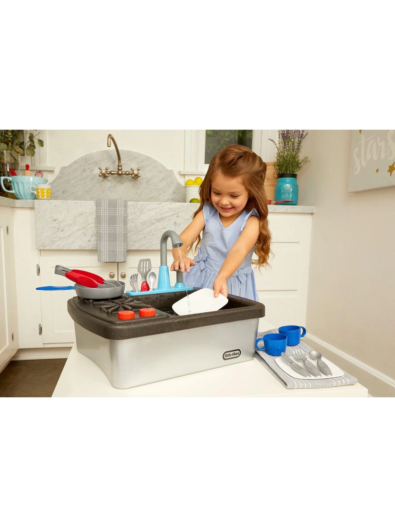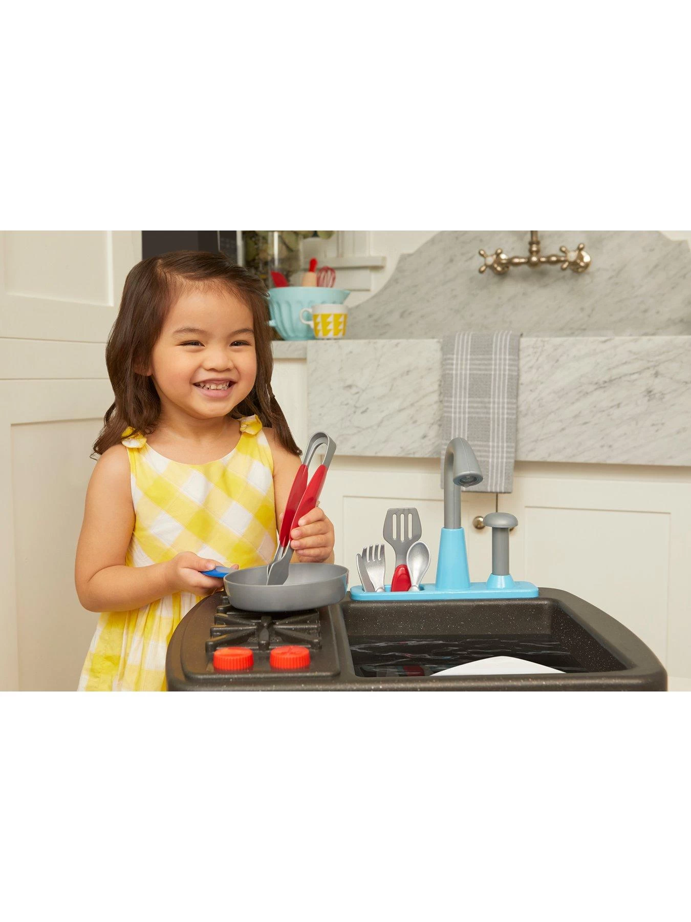 Little ones can pretend to cook and wash dishes just like the grown ups with the realistic Little Tikes First Sink ; Stove. This sleek, modern pretend play combo sink and stove is packed with features: a working water pump, clicking knobs, and more. Plus, it makes realistic sounds when kids turn the knobs on the stove top burners. Pretending to cook, wash dishes, and do other chores helps kids gain a sense of responsibility, an important part of social-emotional learning.The First Sink ; Stove fits all 13 included accessories for easy cleanup too. Encourage kids to engage in imaginative pretend play with the First Sink ; Stove by Little Tikes!