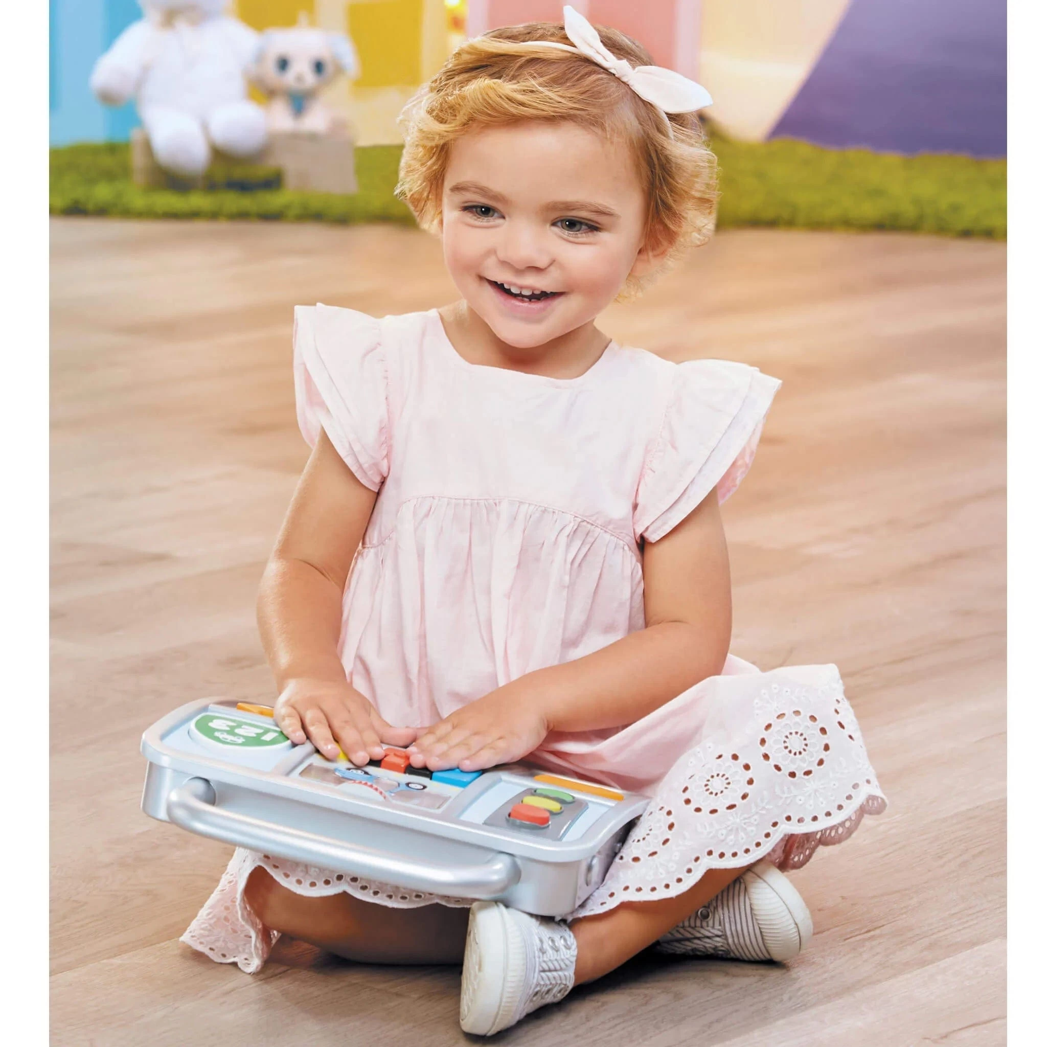 - ON-THE-GO. Easy-to-remove, interactive detachable panel teaches shapes, colors, and letters
