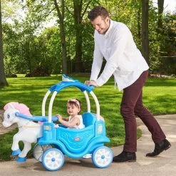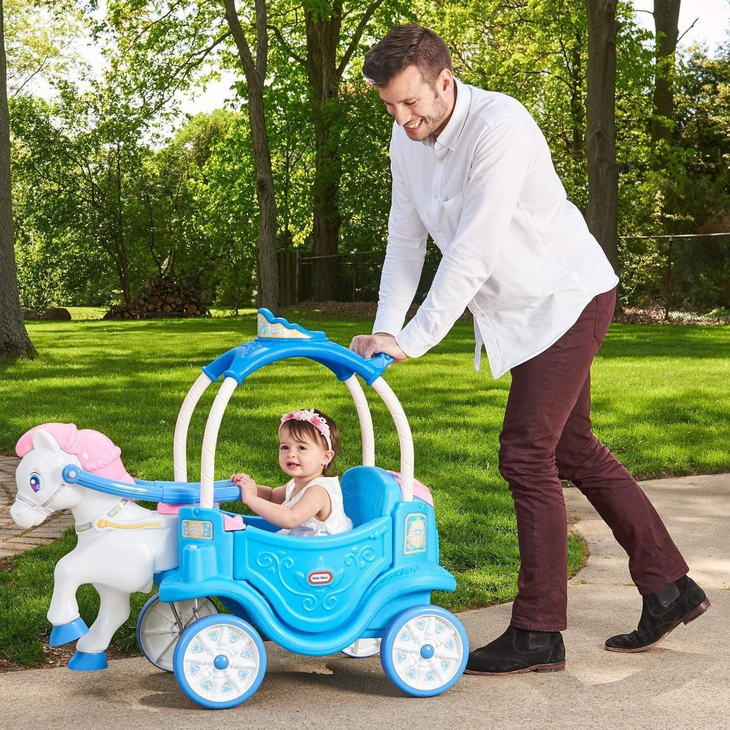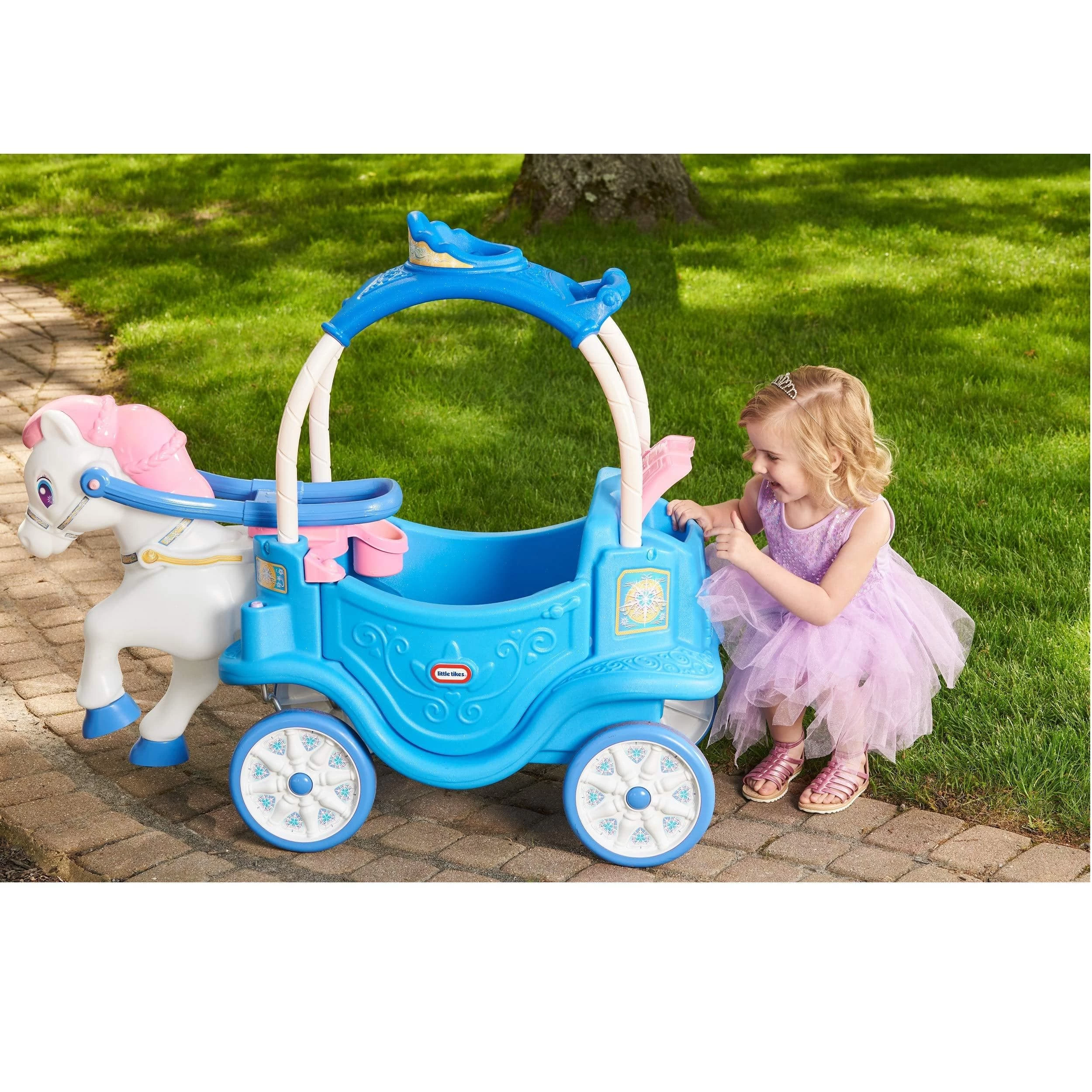 Little girls will beam behind the reins of this magical Little Tikes Princess Horse & Carriage ride-on! Toddlers love the Frosty Blue color and parents love the two-handle design, one for pulling and one to push your child around. As your child grows remove the floor board to convert the carriage to a foot-to-floor ride on toy. The horse and carriage riding toy encourage active play, imagination and developing motor skills.