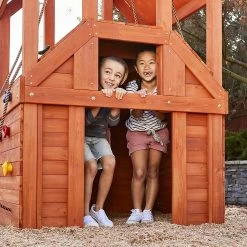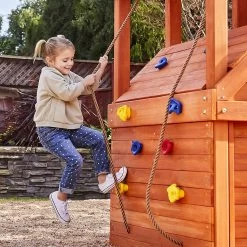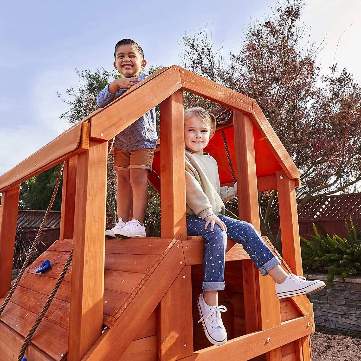 - Little Tikes Real Wood Adventures Outdoor Wooden Climb House for Backyard Fun for Kids 3 – 10 Years Old with Climbing Wall and Climber Ropes.