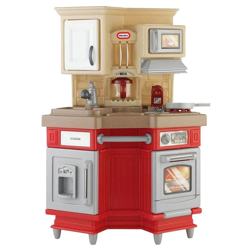 A super kitchen playset with a play stove, oven, refrigerator, coffee pot and more. Your little ones will love pretending, sharing and manipulating the working doors and accessories. The kitchen play set includes play plates, forks, spoons, knives, cups, all your child needs and more. This compact, stylish, modern kitchen makes a great addition to any play area.