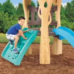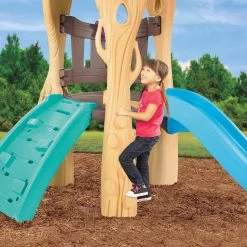 Swings, a kid’s slide, climbing wall, and the lookout tree encourage active and engaging play. The swing set has a color-themed balance that blends in backyards and invites children to play.