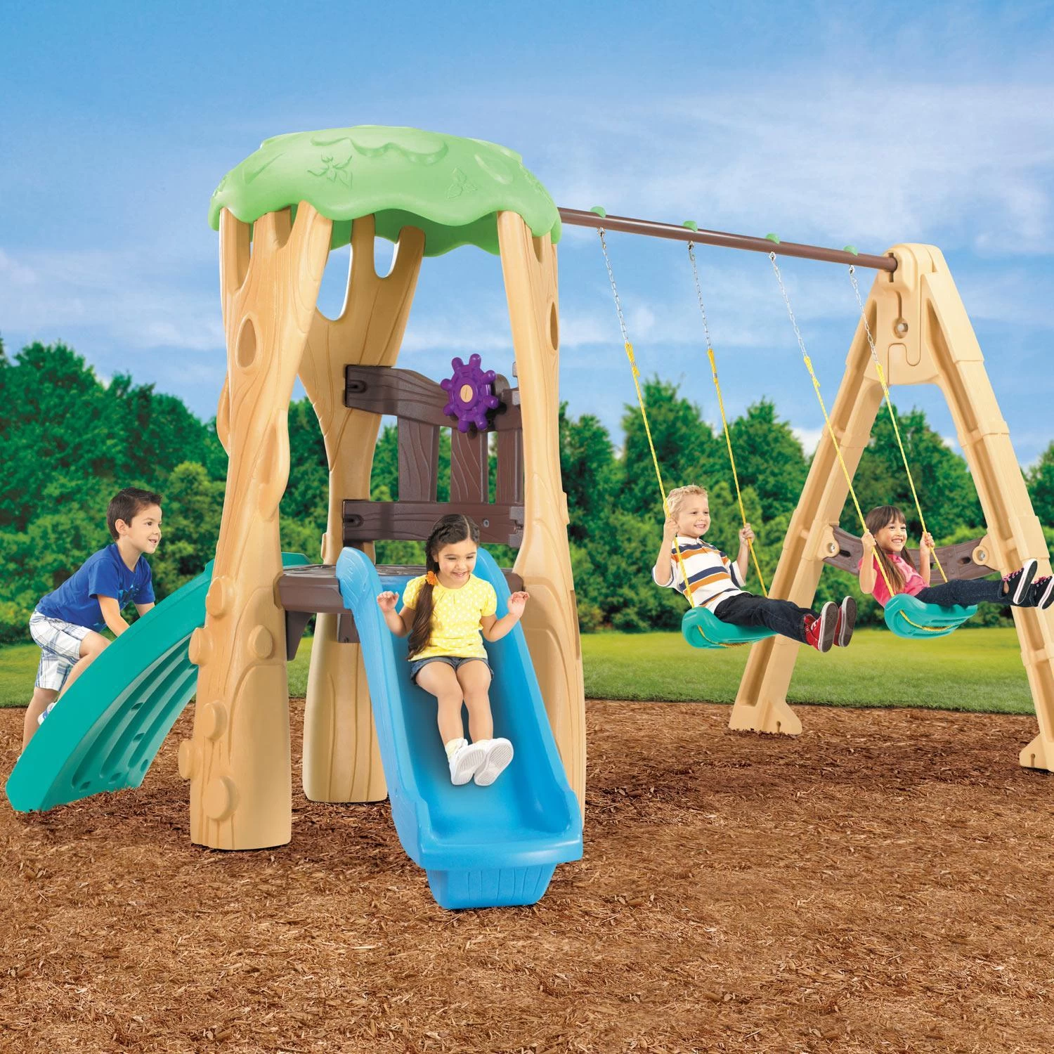 - Tree House Swing Set encourages active play while building a child’s imagination!